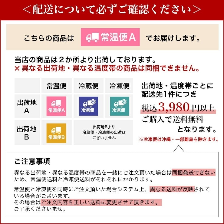 異なる出荷地・温度帯の商品を一緒にご注文いただいた場合、同梱できないためそれぞれに送料がかかります。また、その場合、システム上で異なる送料が反映される場合がございます。その場合は後ほどメールで正しい料金を連絡させて頂きます。ご了承くださいませ。
